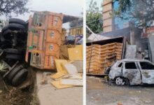 देहरादून के मोहब्बेवाला चौक पर बड़ा हादसा, ट्रक कार पर पलटा; लगी भीषण आग